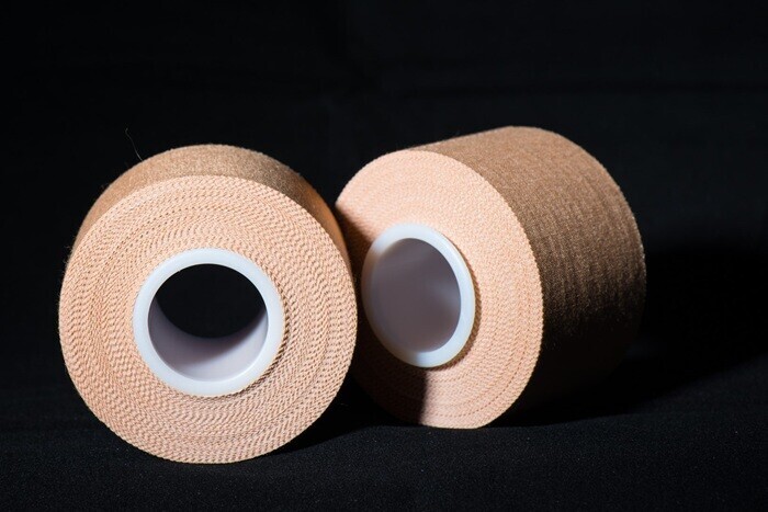 Huismerk Sporttape is een beige, stugge tape met een goede prijs/kwaliteit verhouding. (géén kinesiotape!)
